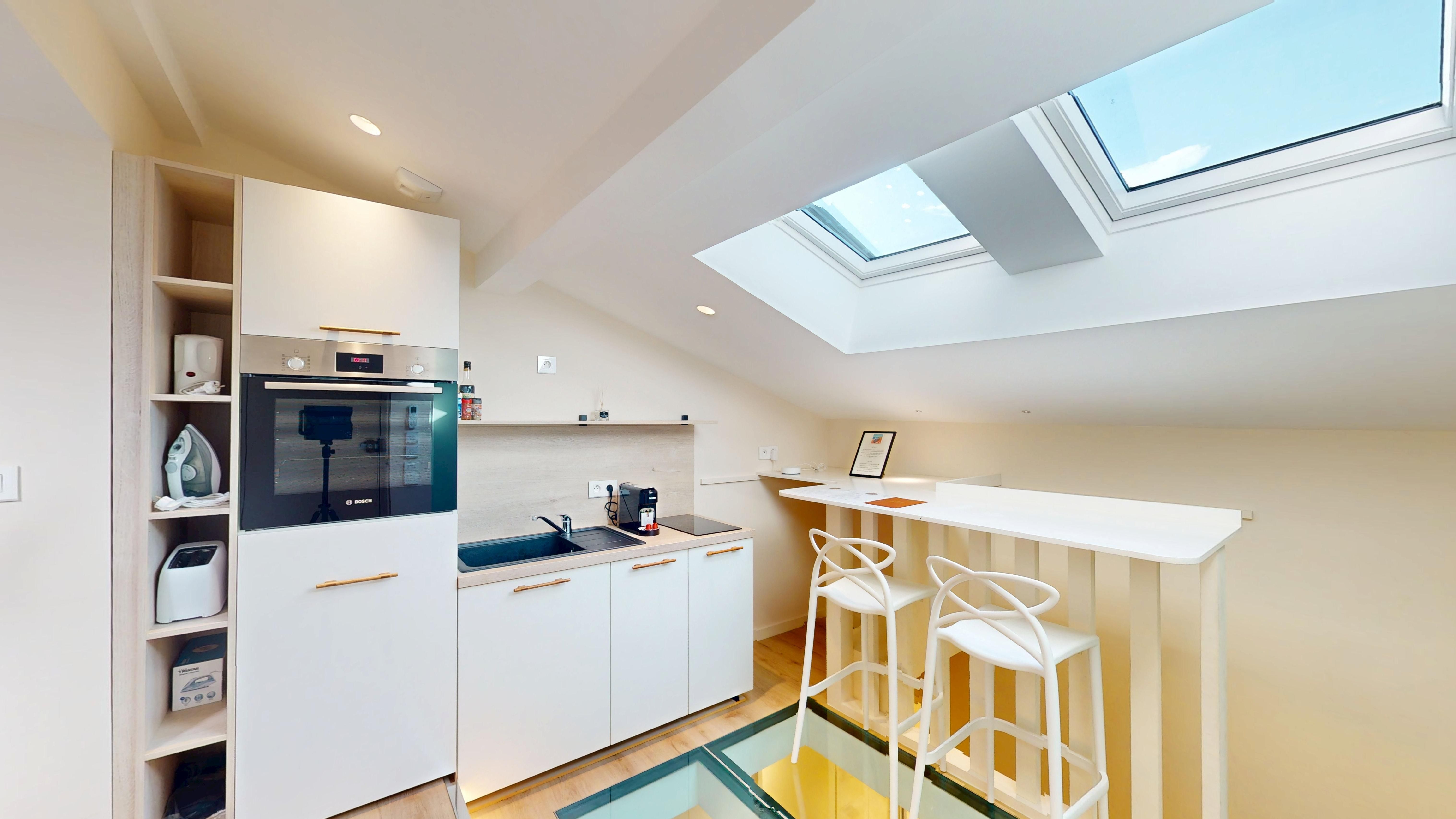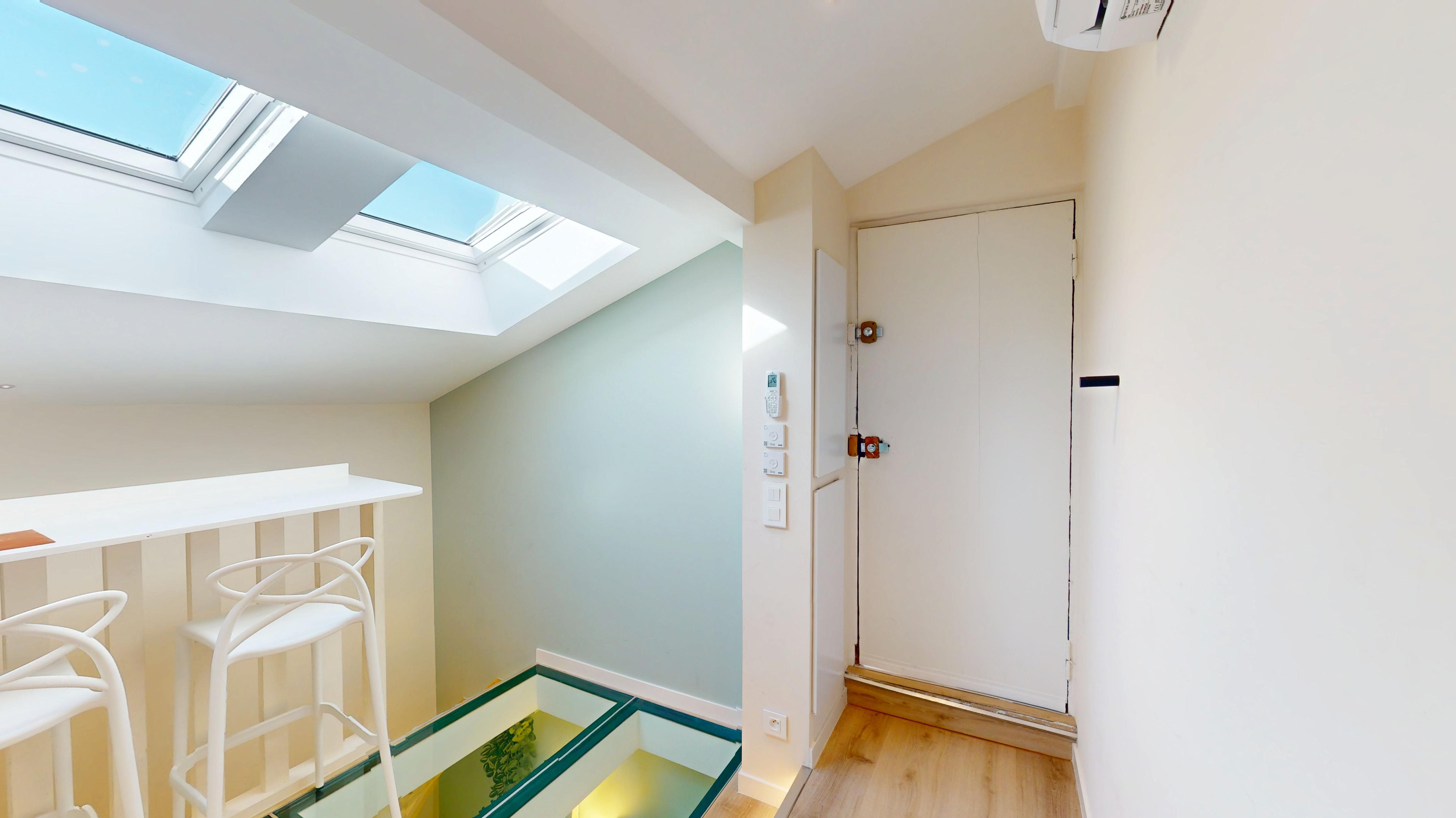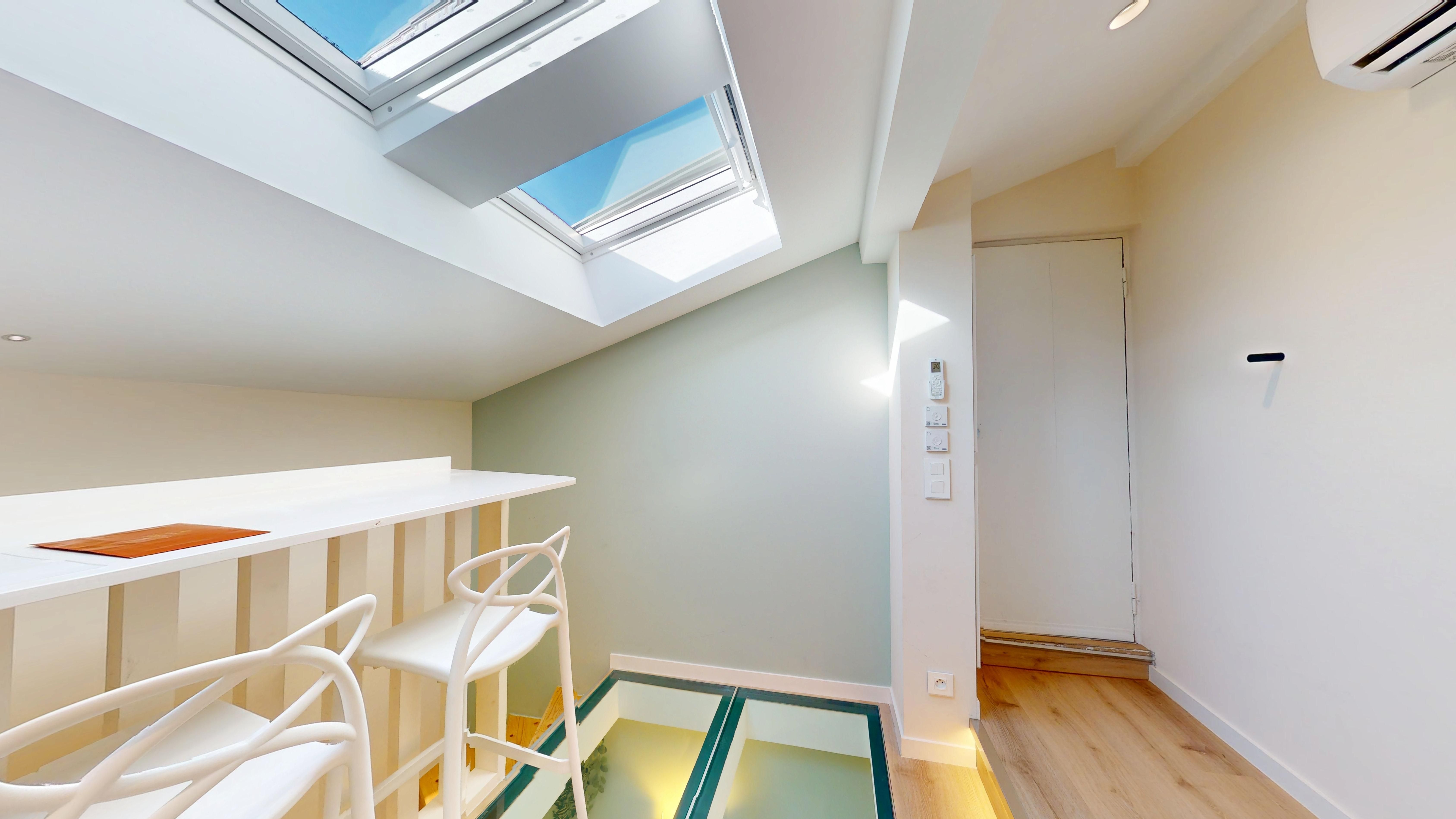 Baigné de soleil grâce à son puits de lumière et son plancher de verre, il se compose d'une cuisine américaine entièrement équipée avec coin repas et cellier, d'une pièce de vie avec espace nuit, d'une salle de douche, ainsi que d'un WC indépendant avec lave-mains.