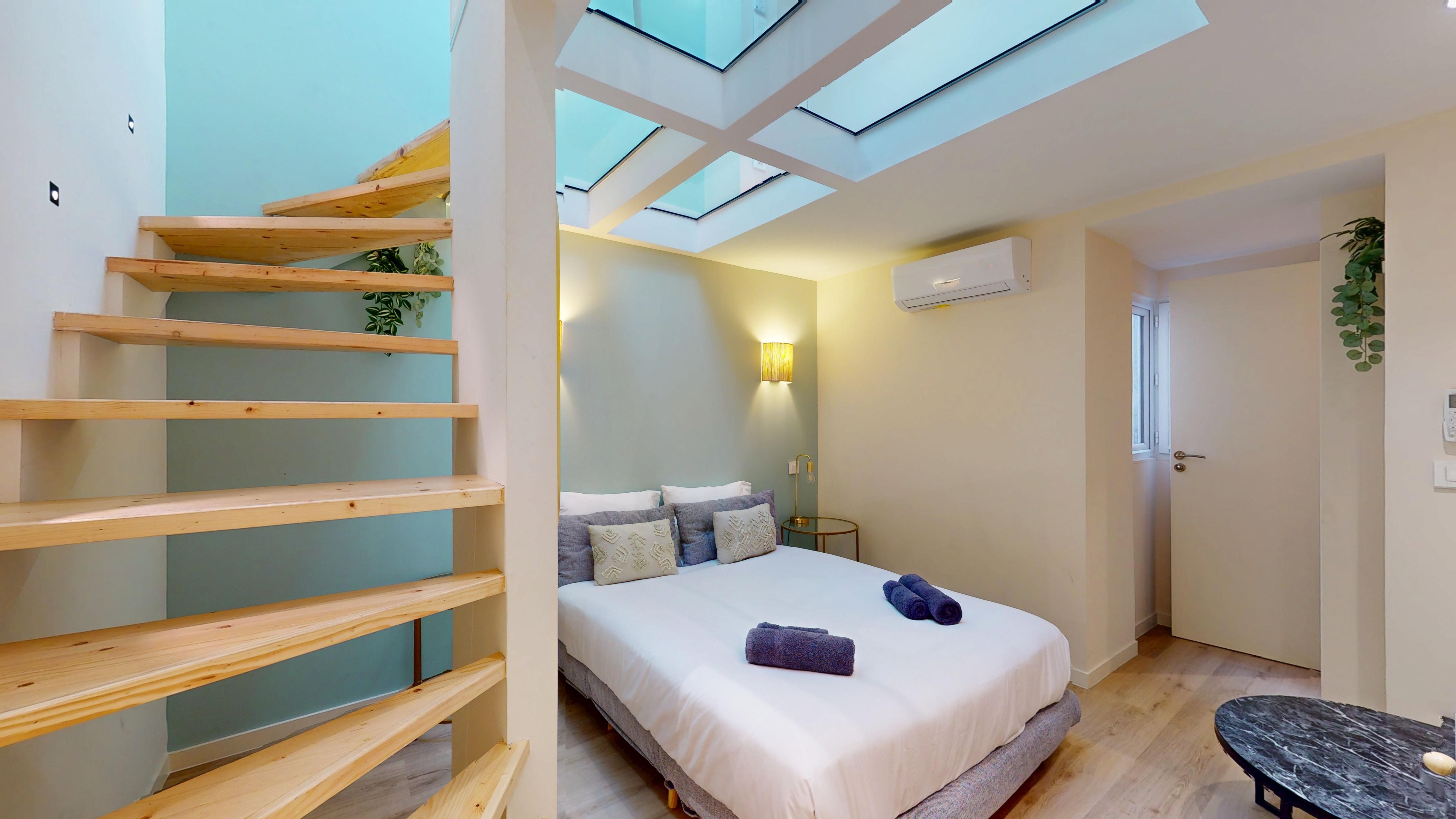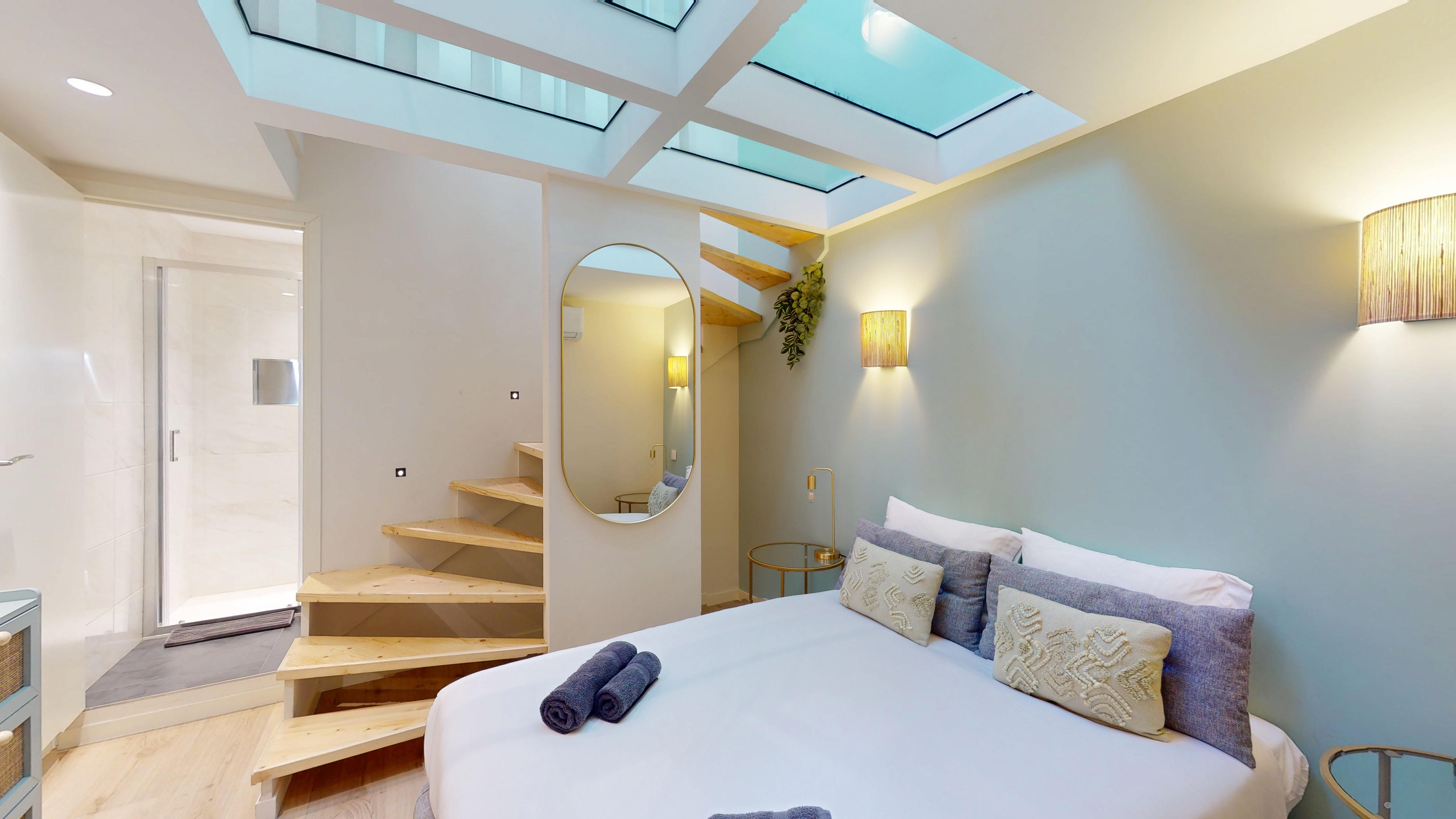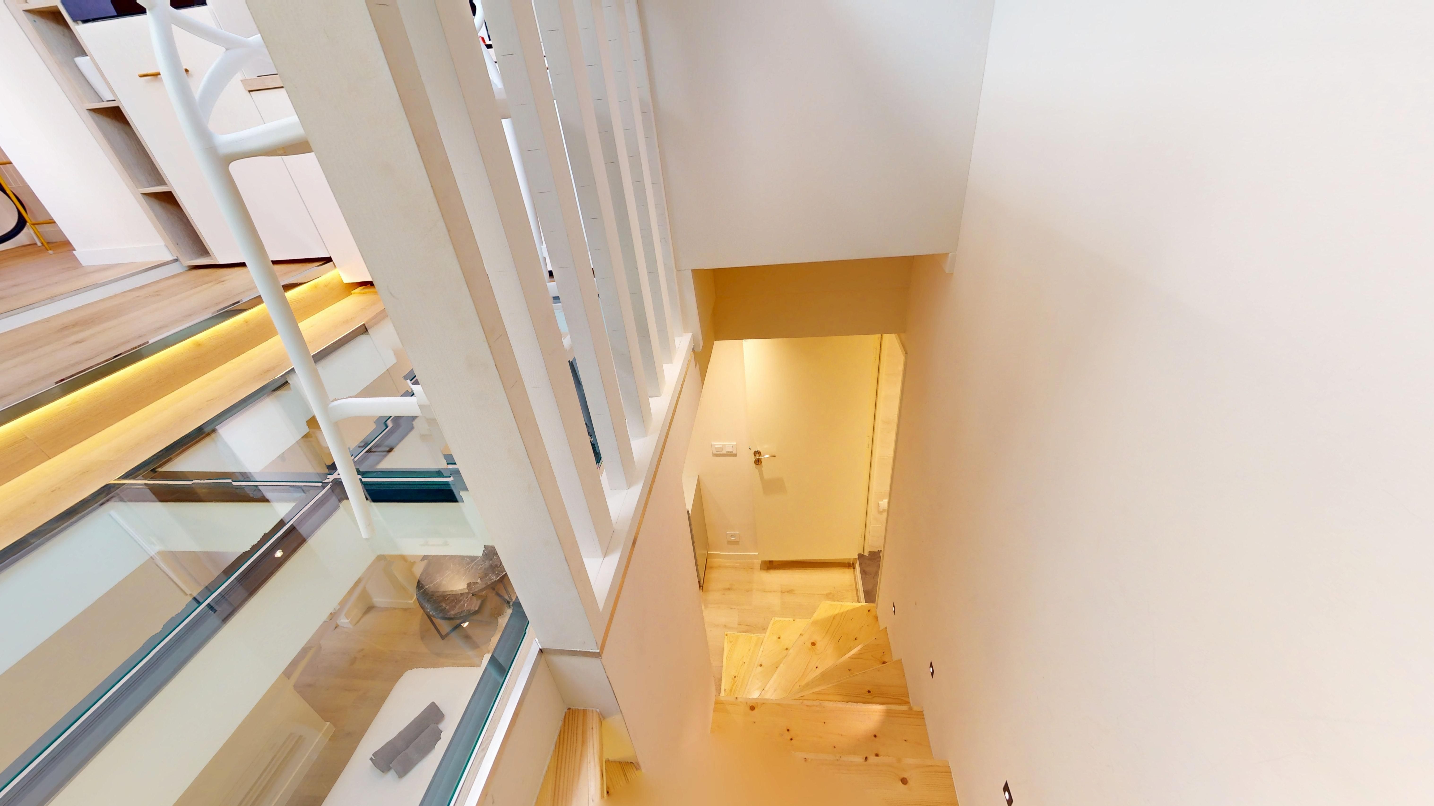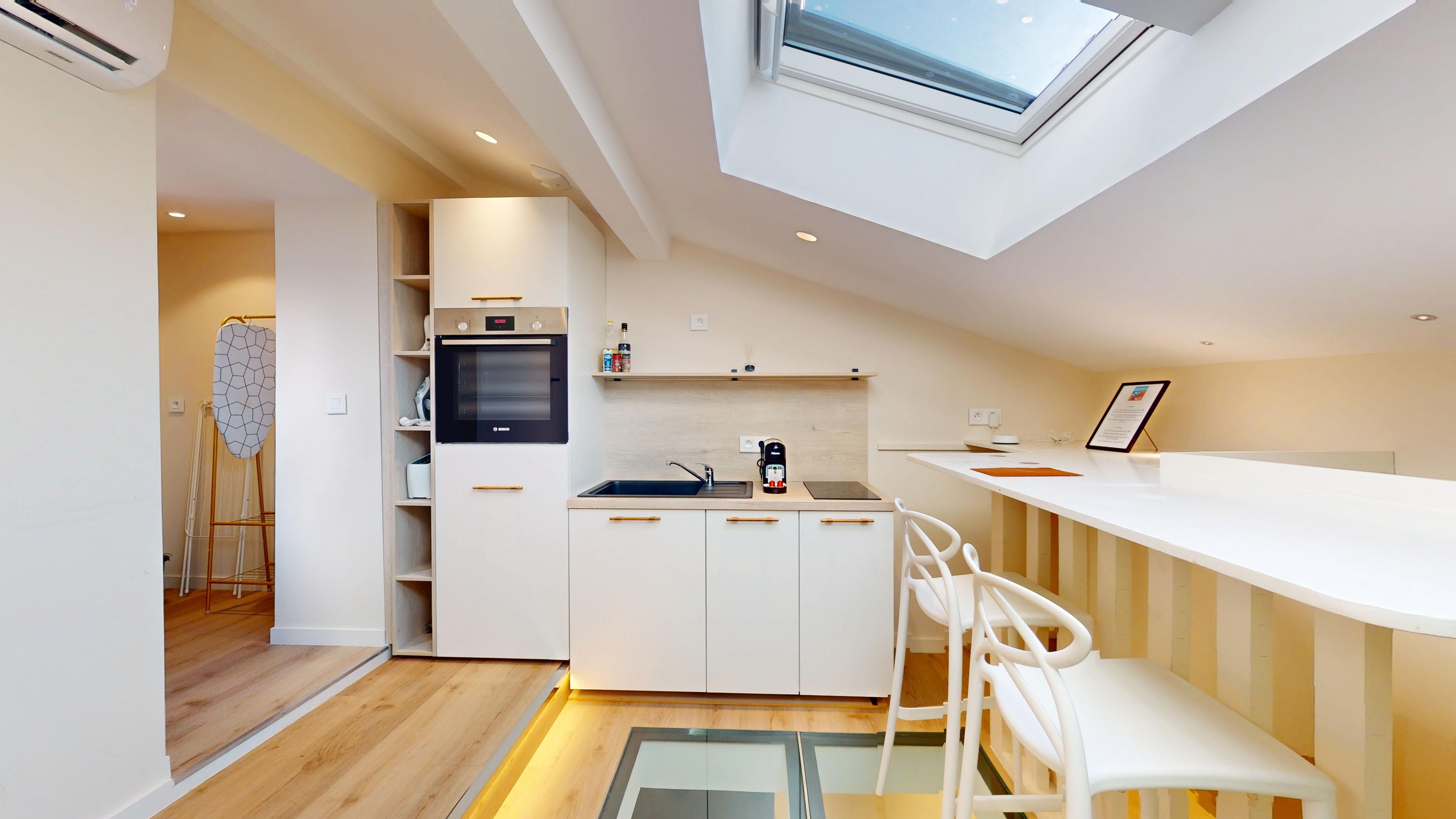 Baigné de soleil grâce à son puits de lumière et son plancher de verre, il se compose d'une cuisine américaine entièrement équipée avec coin repas et cellier, d'une pièce de vie avec espace nuit, d'une salle de douche, ainsi que d'un WC indépendant avec lave-mains.